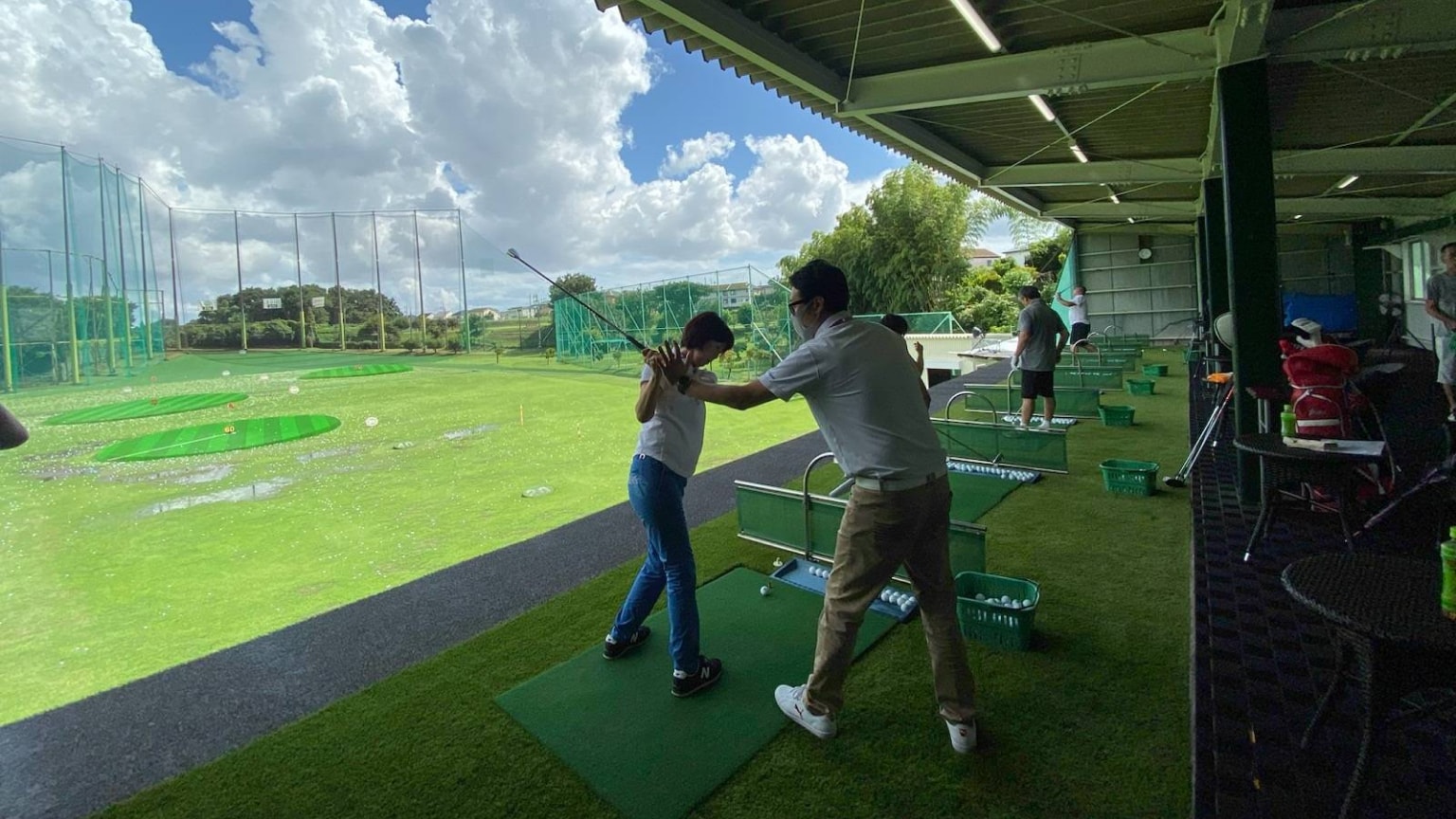 レッスン内容は練習場打席を使用したアウトドアレッスン。